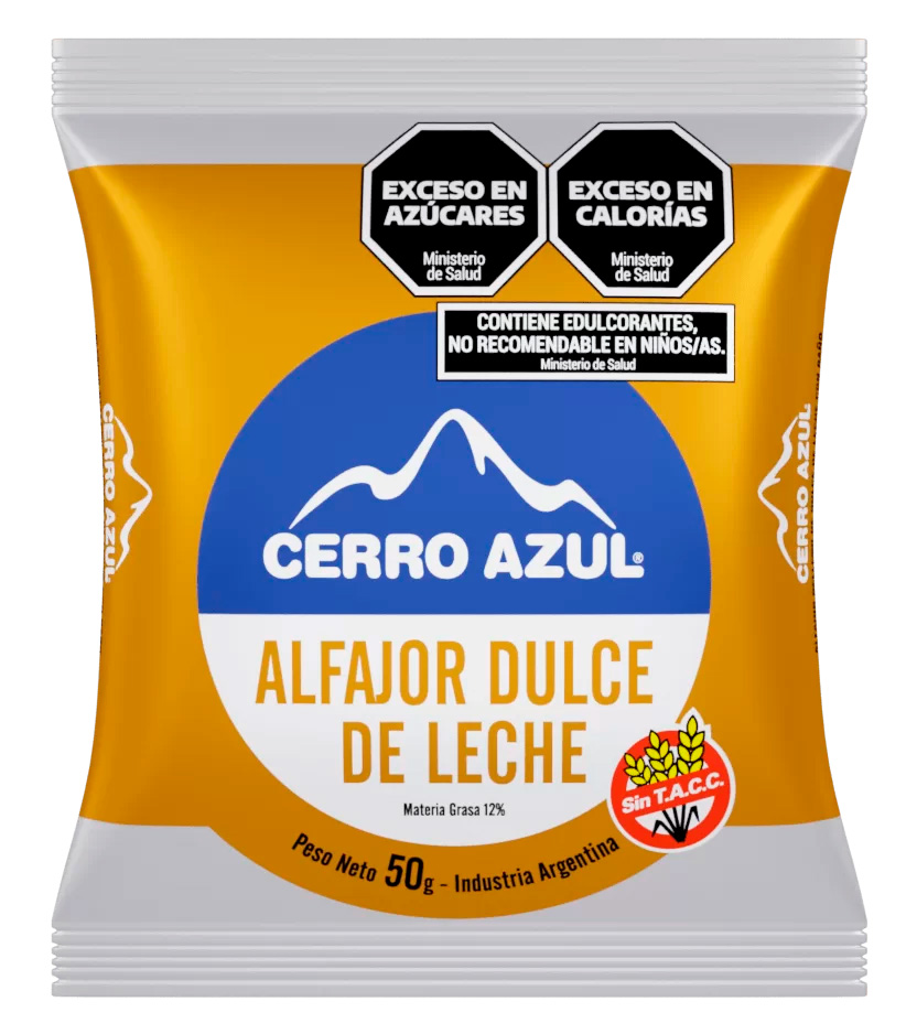 Etiqueta: Alfajor Dulce de leche bañado choco. x 50 gr SIN TACC | CERRO AZUL |